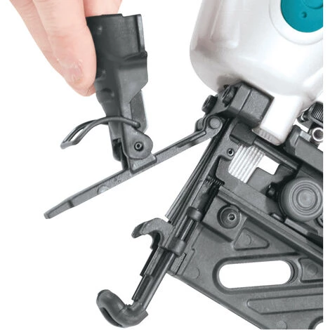 - Ejection facilitée des clous bloqués grâce à la partie avant démontable sans outil.
