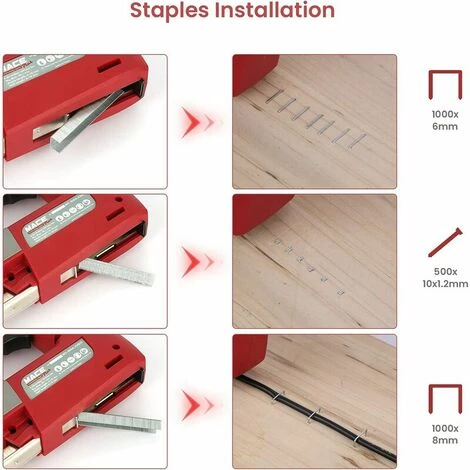 Agrafeuse Electrique Professionnelle: Utilisée pour les devoirs simples, tels que les travaux de décoration, les meubles d’intérieur et les pièces de placage fixes, très adaptées à l’entretien, à la menuiserie, à la cl?ture et à la production de bricolage, etc., peuvent répondre aux divers besoins du travail du bois. Agrafeuse sans Fil: L’agrafeuse sans fil est équipée d’une batterie au lithium-ion de 4,2 V, facile à transporter et à utiliser, et dispose d’un indicateur de batterie qui peut vous fournir des informations sur la batterie et l’état actuel de la batterie. Vous pouvez utiliser la prise USB pour charger. Interrupteur de Sécurité: La machine ne démarre que lorsque la tête du capteur du tournevis à clous est appuyée sur la pièce à travailler pour garantir que vous pouvez travailler en toute sécurité sans tirer le clou avec force. Conception Humanisée: La poignée antidérapante adopte un design humanisé, vous permettant de travailler confortablement et en toute sécurité. Dans le même temps, il est également équipé de coussinets anti-vibrations, qui peuvent vous offrir les meilleures performances et une nouvelle expérience. Conception Non Colmatante: Des clous en forme de U sont utilisés. Il existe trois types de clous: les clous T50, T53, T47, qui peuvent être changés et utilisés. Les clous peuvent être enlevés rapidement, 30 clous par minute, et le processus d’opération est simple et lisse. Seules trois étapes sont nécessaires pour remplacer les clous.