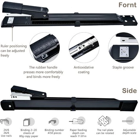 Agrafeuse en métal haute performance, verrouillage du carton réglable, pratique et économique. Les guides réglables sont très utiles et peuvent être attachés à l’unité. L’agrafeuse vous permet de créer l’ordre de confusion des documents