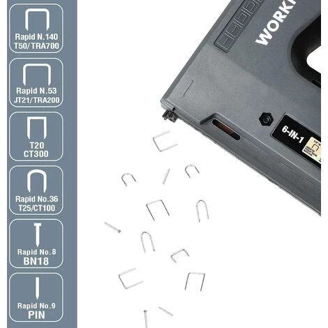 【Fonction 6 EN 1】Cette agrafeuse murale possède une fonction «6 en 1», ce qui est un point fort très pratique. Il est compatible avec 6 types d’agrafes, y compris Rapid Type140/Arrow T50 (6-14mm); Rapid Type 53/Arrow JT21 (6-14mm); Stanley CT300/Arrow T20 (6-14mm); Rapid Type 36/Arrow T25 (10-14mm); Rapid Type 8/Arrow BN18 (15mm); Rapid Type 9/PIN(15mm). Cela vous permet de choisir différentes agrafes ou clous en fonction des matériaux de reliure